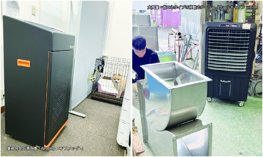 働く環境づくりにも熱心で、工場では大風量・省エネタイプの移動式クーラー「クールキャノン・エコ」を導入し、従業員の熱中症対策を推進。さらに事務所内には業務用空気清浄機「Airsmeg-エアスメッグ-」を取り入れ、快適で働きやすい職場環境づくりにご尽力されています。