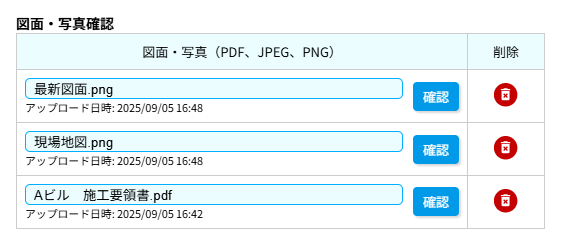 PDFやJPEGなどの資料を現場ごとに最大20件までアップロードが可能です。