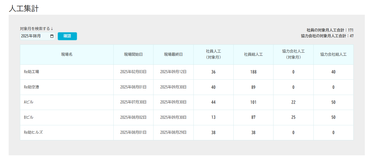 配置した人員を現場別・月別に自動集計。毎月の事務作業を大幅に効率化します。